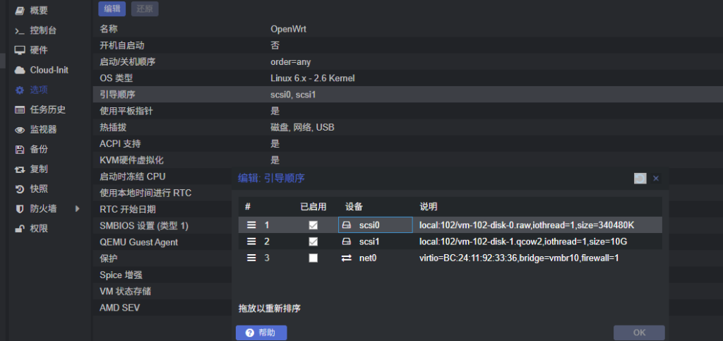 然后点击选项 找到引导顺序 双击编辑 将刚刚添加的磁盘设置为第一启动项目